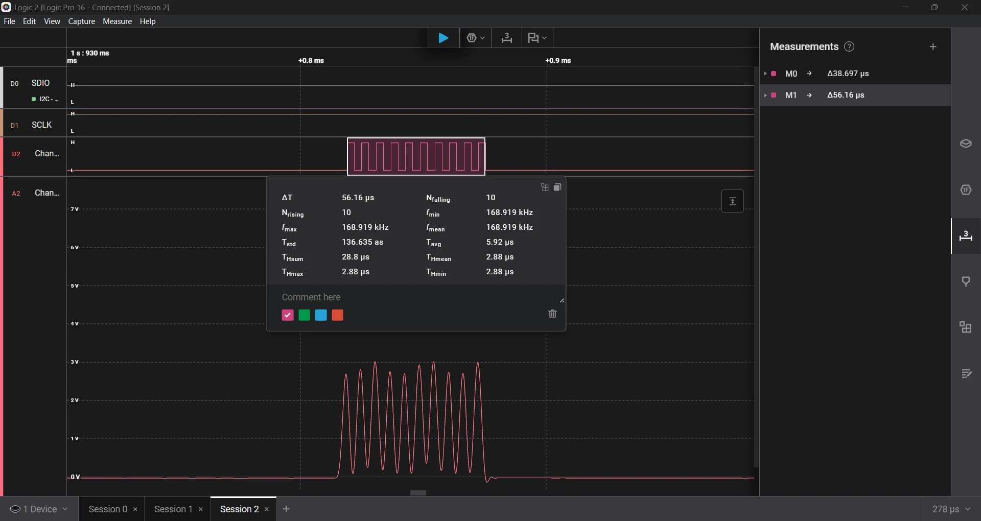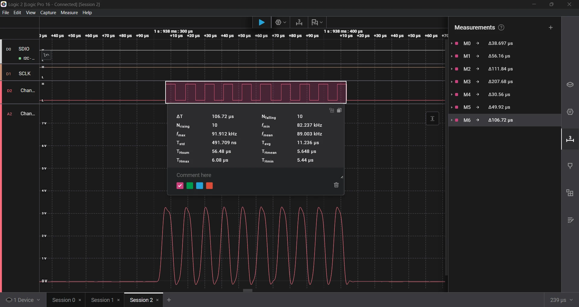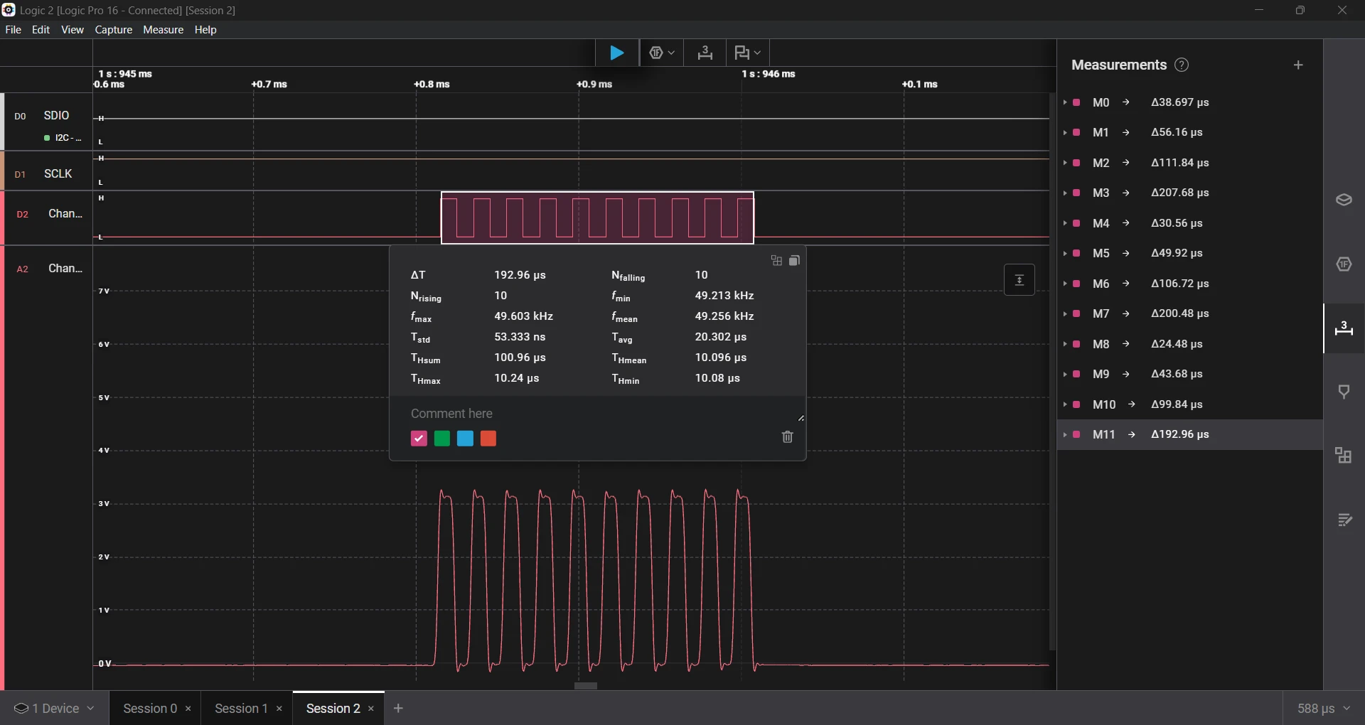 I ran the test sequence and captured the results with the Saleae Logic Analyzer. I had to install a few measurement extensions. With those, I was able to view the smallest, largest, and average delay values.