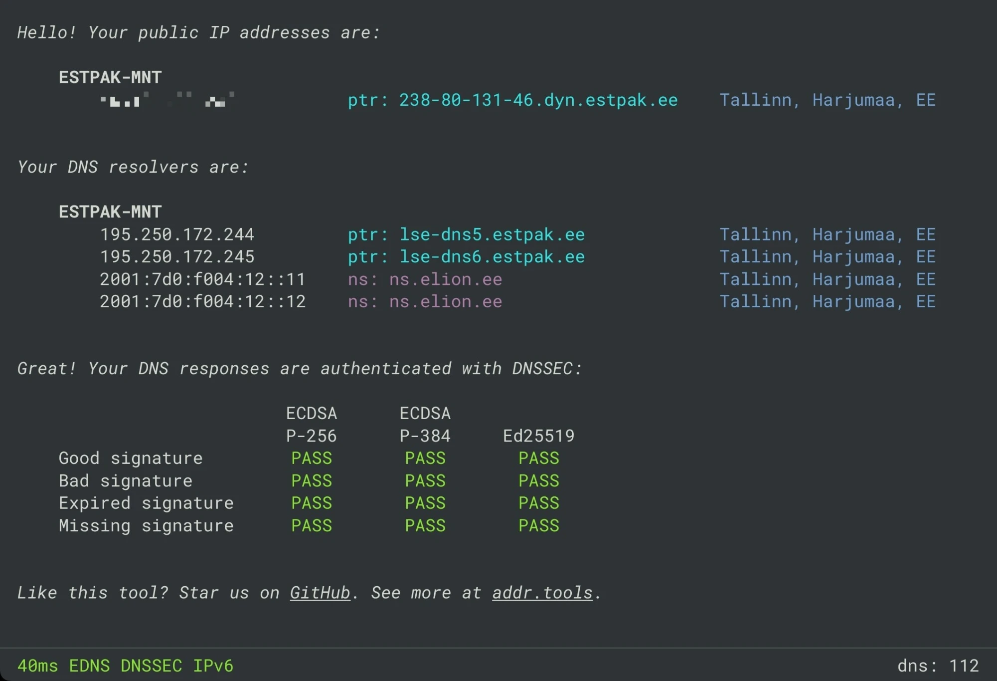 For example, let’s look at a typical Telia Estonia WAN DNS configuration using dnscheck.tools. The results show two sets of DNS resolvers, one for IPv4 and one for IPv6, both controlled by the ISP. Since DNS queries are sent in plaintext, your ISP can monitor every site you visit, build a profile of your online habits, and potentially share or sell that data.