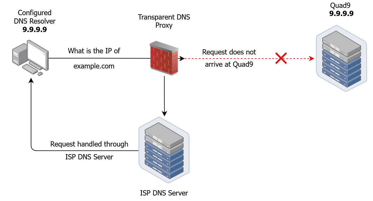 9.9.9.9, to obtain the IP address forexample.com. - However, instead of reaching the Quad9 DNS server, the request is redirected to the ISP's DNS server.