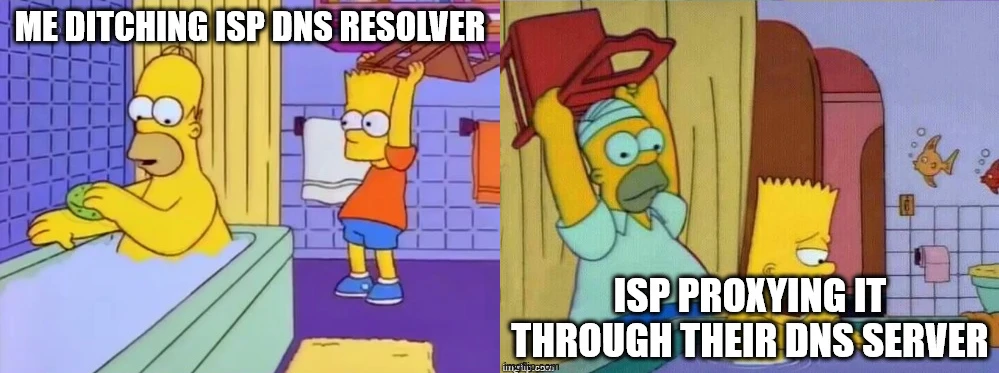 Even if you switch to a custom DNS resolver, some ISPs use transparent DNS proxies to intercept and redirect your queries back to their own servers. This means that even if our network is carefully set up to use 9.9.9.9, those queries could still be hijacked and forced through the ISP's servers. Since DNS on port 53 is sent in plain text, it's vulnerable to this kind of manipulation.
